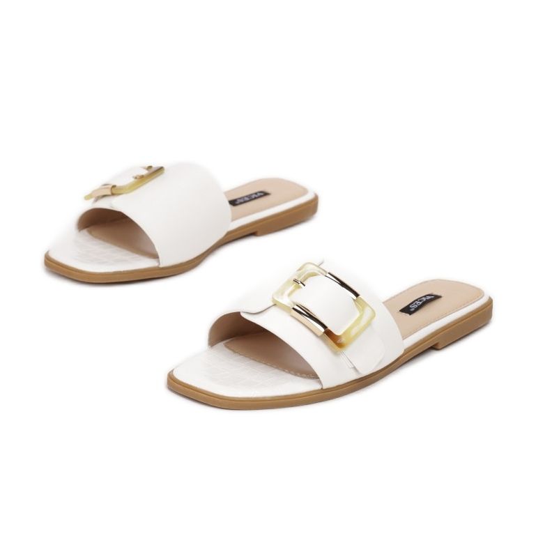 Vi presenterar Vices 7356-71 flipflops för kvinnor i en elegant kombination av vitt och guld, perfekt för vardagsstyling. Dessa unika platta sandaler glider på för komfort och snabb påtagning. En bred rem framtill, dekorerad med ett stort spänne, ger karaktär och en moderiktig accent till skorna.