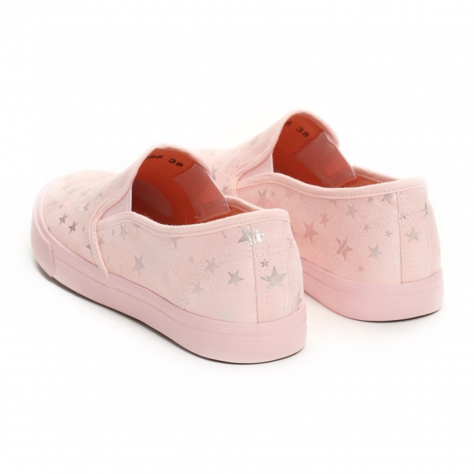 Sneakersna kännetecknas av en praktisk, slip-on-knäppning, som gör att de snabbt och enkelt kan tas på. Den runda tån och den platta sulan av rosa gummi garanterar komfort och rörelsefrihet. Insidan av skorna är fodrad med mjukt textilmaterial, vilket ytterligare ökar användarkomforten.