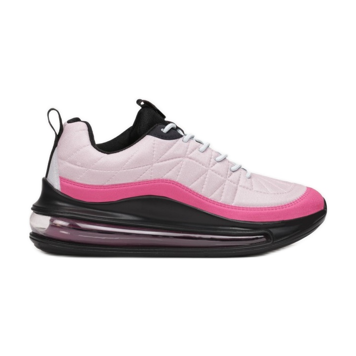 Dessa sportskor är monterade på en solid 5-centimeters plattform som garanterar komfort när du går. En intressant accent är en mörkrosa plastremsa placerad ovanför plattformen, vilket lockar ögat och betonar den moderna designen. Den runda tån och den svarta plösen med snören säkerställer perfekt passform och komfort att bära.