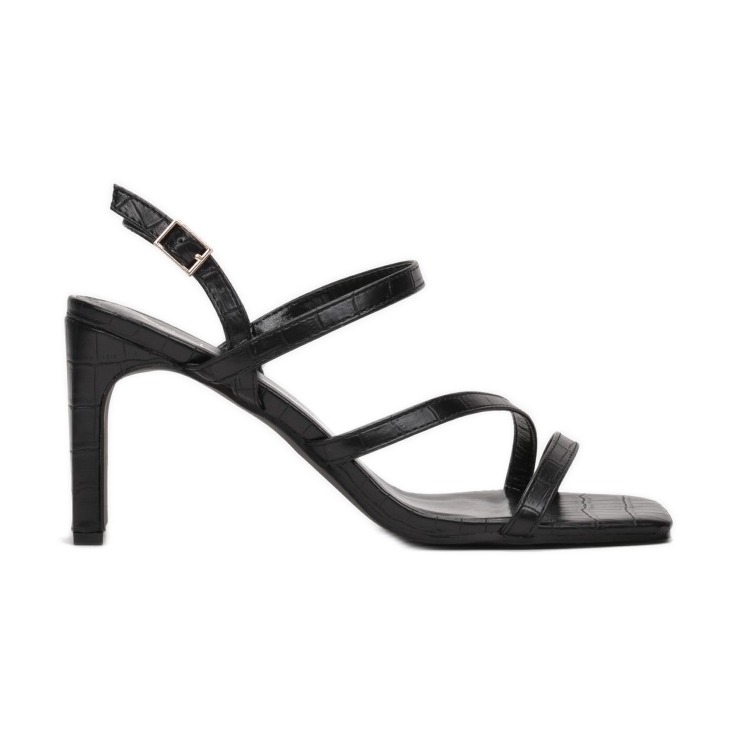 En hög stolpe med en höjd på 8 cm tillför smalhet till siluetten och garanterar samtidigt stabilitet under gång. Spännet gör det lättare att ta på och anpassa skorna efter din fot. Sandalerna har ingen tå, vilket ger dem lätthet och en modern karaktär.