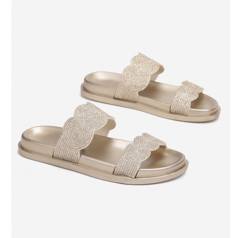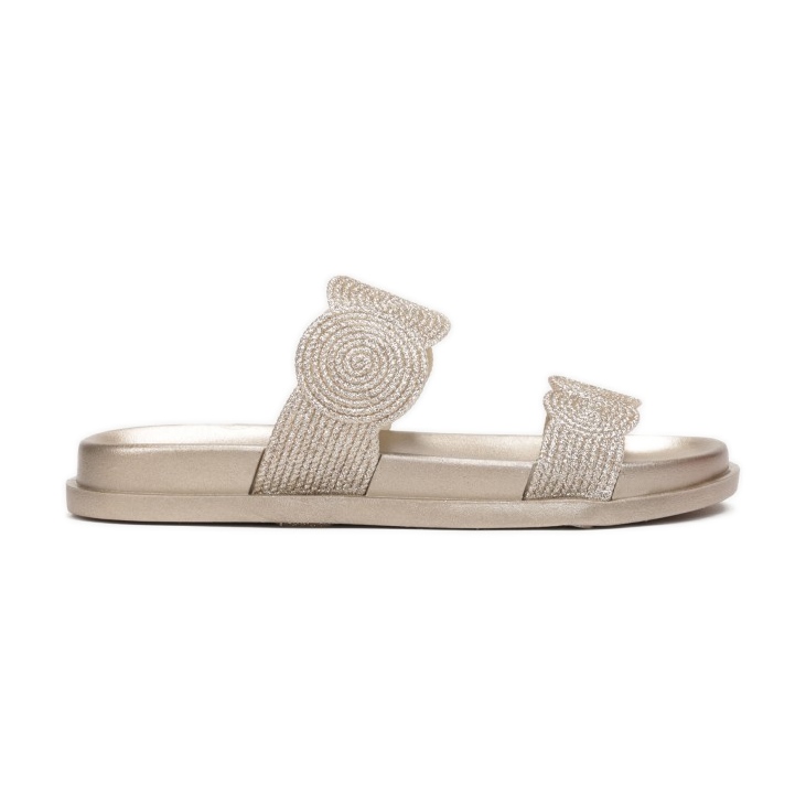 Vi presenterar Vices GJ-3-60-gold slip-on rutschkanor, som kombinerar komfort med moderiktig stil! Dessa unika flip-flops, i en elegant guldfärg, väcker uppmärksamhet med sin ursprungliga form och imponerande, vågiga ränder dekorerade med glitter. Tack vare den exponerade tån och mellanfoten kan dina fötter andas och du kommer att känna dig bekväm i dem hela dagen lång.