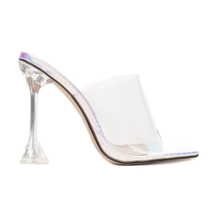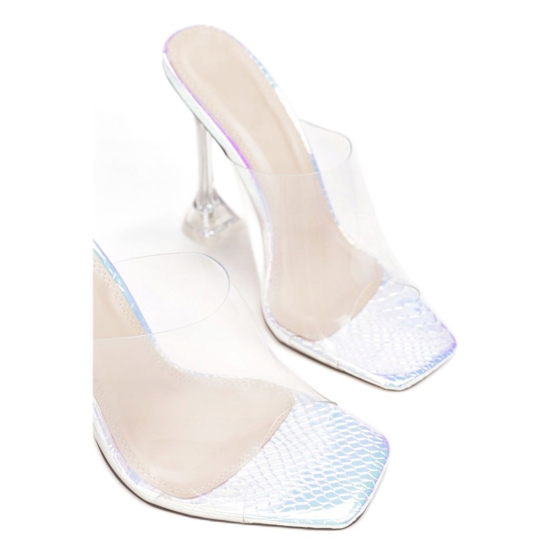 Dessa flipflops kännetecknas av en rundad tå och öppna tår, vilket gör att foten kan andas fritt och avslöjar en elegant manikyr. Den genomskinliga silikonremmen anpassar sig perfekt till foten, och den metalliska innersulan dekorerad med prägling i form av fiskfjäll ger dem en unik karaktär.