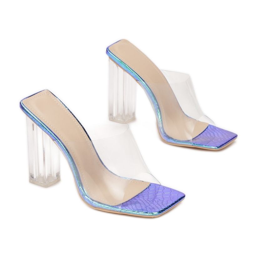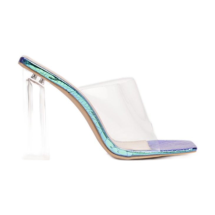 Framsidan av flip-flops är dekorerad med ett brett band som perfekt håller fötterna samtidigt som det garanterar komfort att bära. Hälen och remmen är gjorda av transparent material vilket ger dem en modern och lite futuristisk karaktär. Innersulan, gjord av en kombination av slätt eko-läder och dekorerad med ormprägling, lockar inte bara ögat, utan säkerställer också komfort när du går. Dessutom är flip-flopsna dekorerade med glitter och ett hologram, vilket gör dem inte bara till skor, utan också till en riktig dekoration av vilken styling som helst.