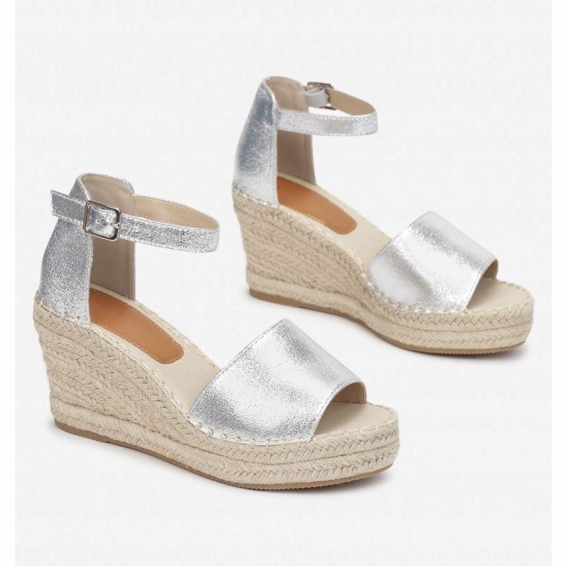 Denna modell utmärks av en bred rem framtill och en uppbyggd klack vilket ger den en klassisk men modern look. Spännet vid ankeln framhäver inte bara fotens känslighet, utan garanterar också stabilitet under gång. Att täcka sandalerna med glänsande eko-läder ger dem en elegant glans, och juteflätan som omsluter hela strukturen tillför lite naturlighet och boho-stil.