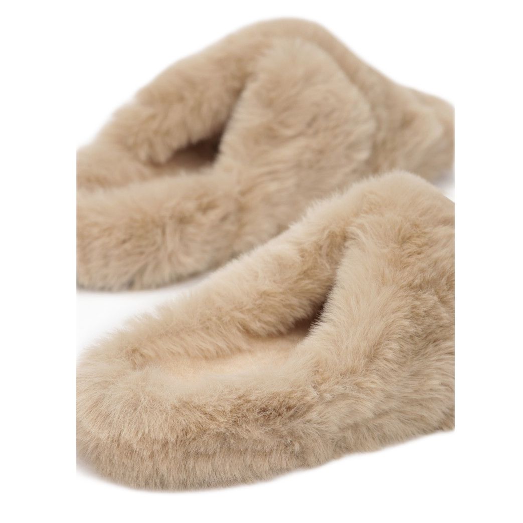 Denna modell kännetecknas av två korsade, stabiliserande remmar vid fingrarna, som inte bara ger stil, utan också ger tillräckligt stöd. Dessa flip-flops är gjorda av material som imiterar päls och ger en behaglig bärupplevelse, och innersulan i eko-mocka garanterar mjukhet och komfort för fötterna.