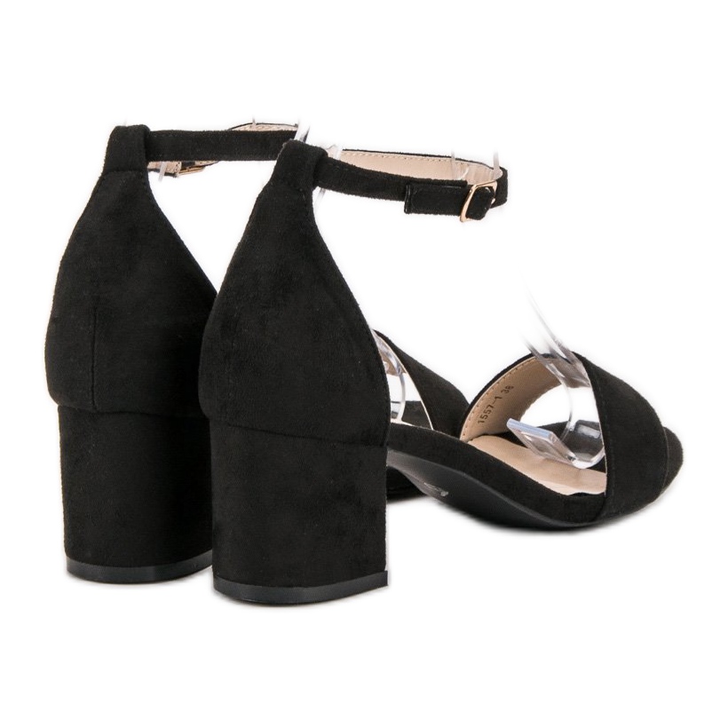 VICES svarta mockasandaler är en perfekt kombination av elegans och komfort som varje kvinna borde ha i sin garderob. Dessa klassiska skor är gjorda av miljövänlig mocka och lägger till chic till alla kläder. En stabil 6 cm klack gör den bekväm att bära hela dagen, både under vardagsutflykter och vid speciella tillfällen.