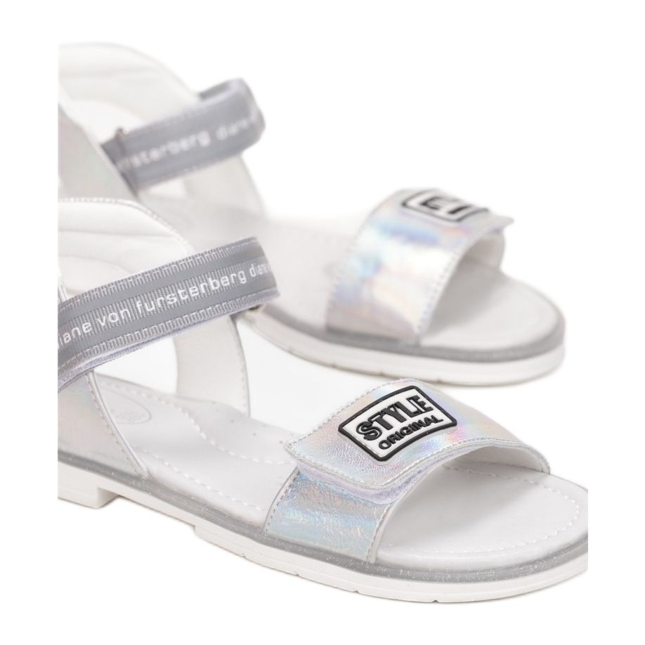 Sandalerna sitter på en platt sula med slitbana och ger stabilitet och komfort när du spelar utomhus. Den glänsande, glittrande klädseln ger dem en unik charm och väcker uppmärksamhet. Tack vare kardborrefästningen är det mycket enkelt att ta av och sätta på sandalerna, och ytterligare remmar dekorerade med lappar med inskriptioner ger en fashionabel accent.