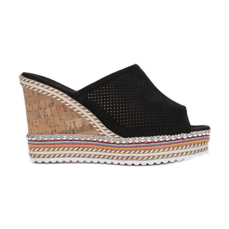 Dessa slip-on mulor har en öppen tå, vilket gör dem till det perfekta valet för sommardagar. Breda remmar med genombrutna utskärningar och dekorativa beslag och snören kompletterar helheten perfekt och ger skorna lätthet och elegans på samma gång. Dessutom ger imiterade pärlor en touch av glamour, vilket gör dem till ett perfekt val för både vardagsutflykter och mindre formella tillfällen.