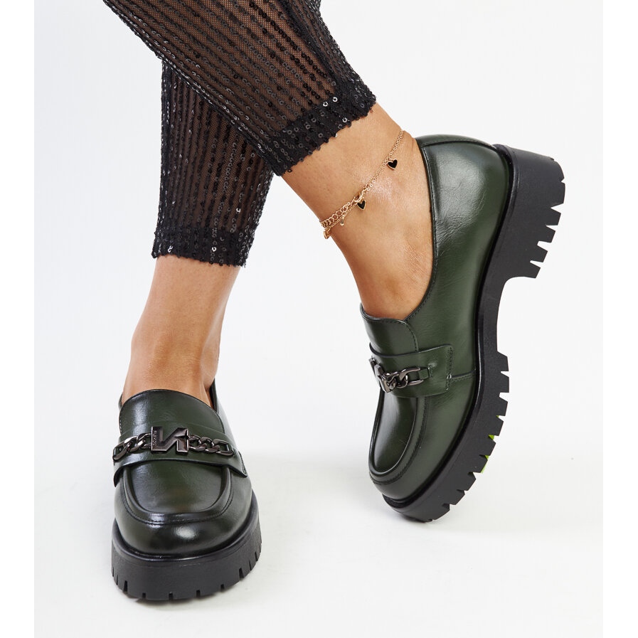 Vinceza Green Leather Loafers är ett utmärkt val för kvinnor som värderar elegans i kombination med komfort. Dessa loafers är tillverkade av högkvalitativt naturläder och glädjer sig inte bara med sin färg, utan också med en noggrann finish och fashionabla detalj i form av en kedja, vilket ger dem en unik karaktär.