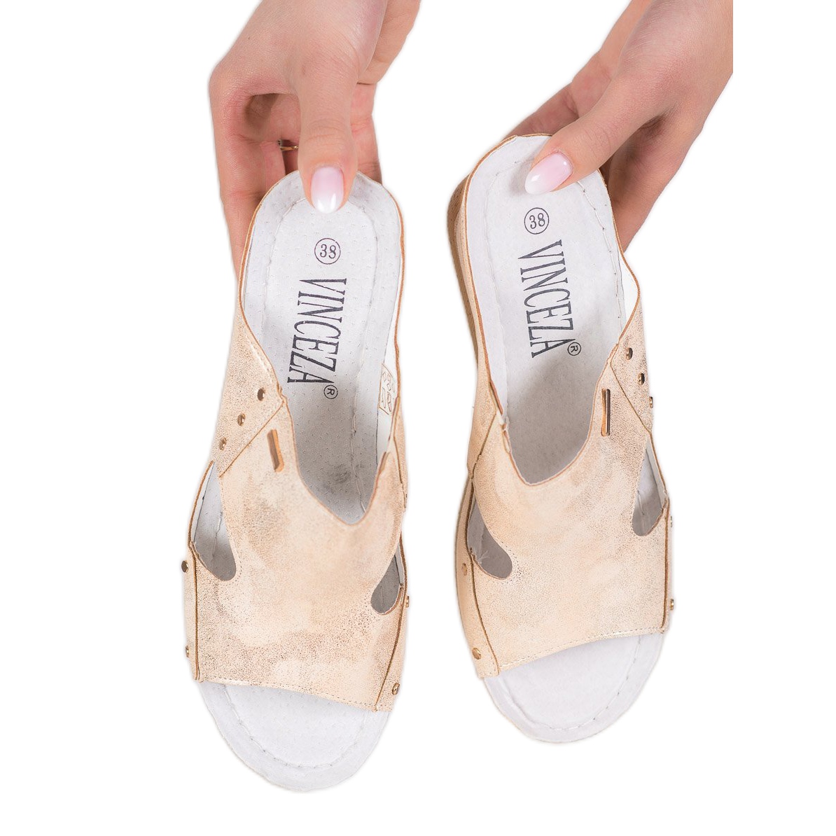 Upptäck oöverträffad stil och komfort med VINCEZA wedge mulor i en fantastisk guldfärg! Dessa unika skor är ett idealiskt förslag för kvinnor som värdesätter originalitet och vardagselegans. Gjorda av högkvalitativt ekologiskt läder, flipflopsna ser inte bara moderiktiga ut utan är också miljövänliga.