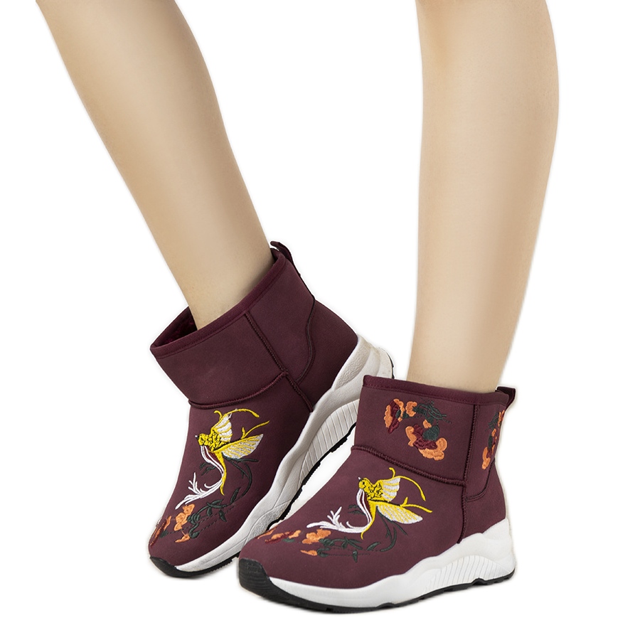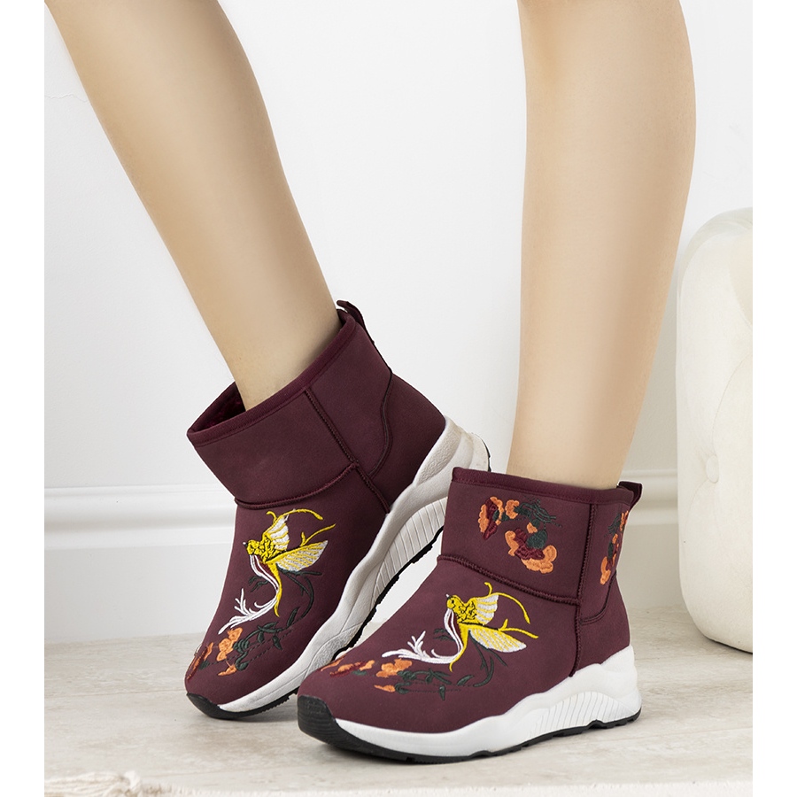 Jamilas eleganta snöstövlar i den mörkröda skuggan är en kombination av fashionabelt utseende och praktiska. Dekorativt broderi ger dem en subtil charm till dem, och den mjuka, isolerade pälsen ger komfort och värme även på kallare dagar. Ett högre snitt med en massiv, vit sula modellerar fint figuren och blandar sig bra med vinterstyliseringar.
