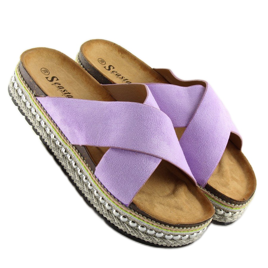 Dessa flipflops är gjorda av ekologisk mocka av hög kvalitet och ser extremt eleganta ut. Den lila färgen i kombination med strass ger charm och originalitet. Insidan av flip-flops är avslutad med ett mjukt tyg, vilket garanterar bekvämlighet och komfort när de bärs.