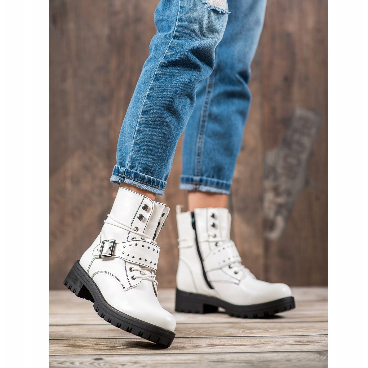 Tillverkade av högkvalitativt ekologiskt läder, de garanterar hållbarhet och komfort. Det dekorativa spännet och strass ger dem karaktär och framhäver deras unika stil. Den svarta, tjocka sulan kontrasterar perfekt med den vita färgen på ovandelen, vilket skapar en harmonisk helhet.