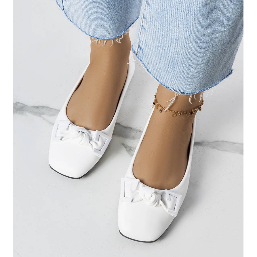 Vi presenterar vita Tabitha-balettlägenheter med rosett - det perfekta valet för varje kvinna som värdesätter stil och komfort. Dessa eleganta skor, gjorda av högkvalitativt ekologiskt läder, njuter av sin minimalistiska design. De har en låg ovandel och en fyrkantig tå, vilket ger dem en modern karaktär.