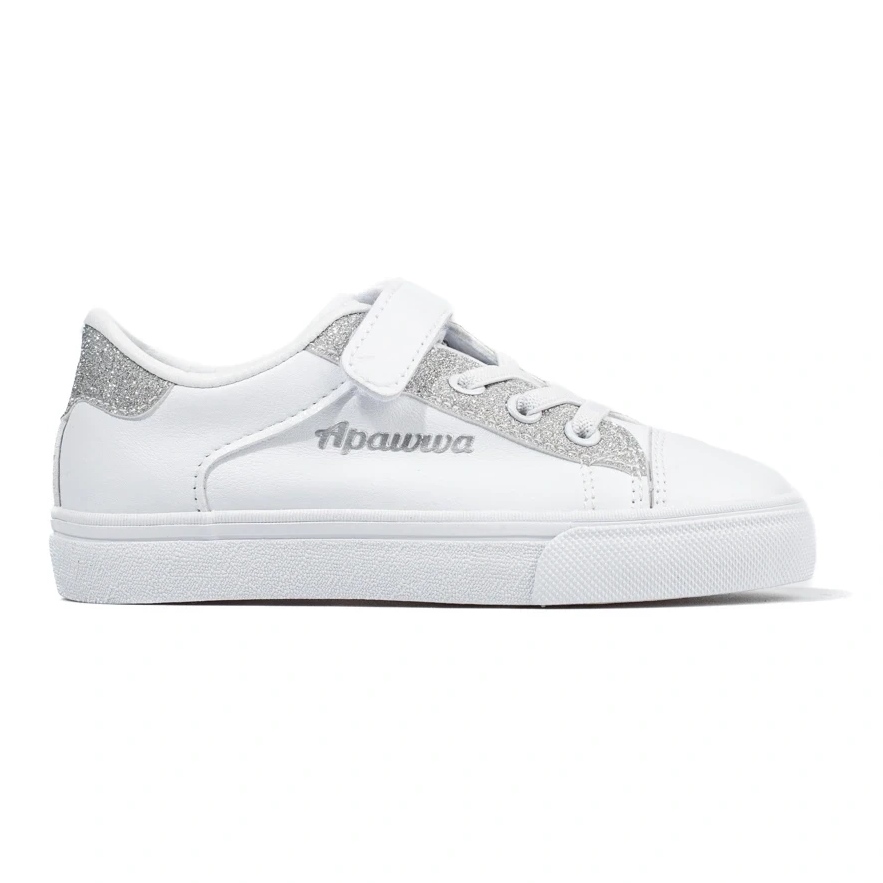 Snygga och bekväma sneakers för flickor som kombinerar en sportig karaktär med en blank accent. Vit med silverglitter, på praktisk kardborrband - perfekt för skolan, dagis och varje dag.
