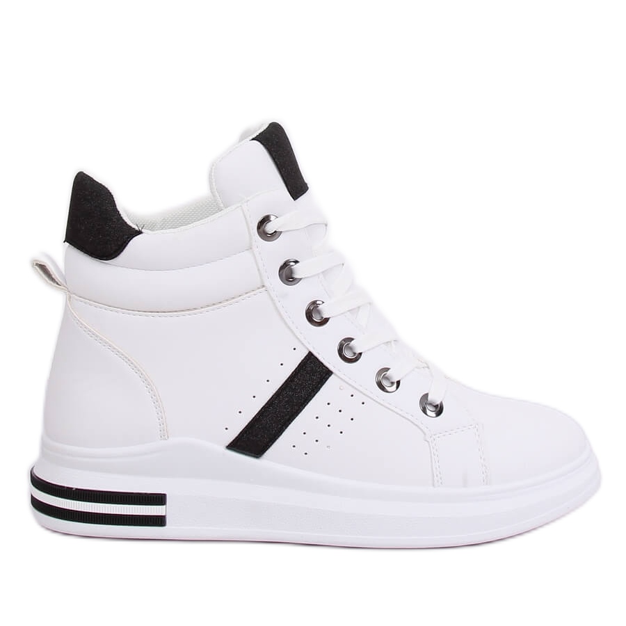 Lär känna de vita high-top sneakers CB-19078 WHITE/BLACK - perfekta för alla tillfällen! Dessa damsneakers med snörning drar till sig uppmärksamhet med sin snygga form och glänsande glitterinlägg, som ger dem en unik karaktär. Den höga sulan, 3 cm hög, ökar inte bara bärkomforten, utan skapar också en moderiktig look som passar perfekt till olika stilar.