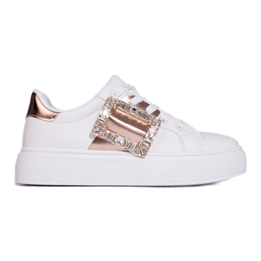 Dessa sneakers är gjorda av ekologiskt läder av hög kvalitet och kännetecknas inte bara av en elegant vit färg, utan också av en iögonfallande guldinsats. Tillbehör i form av zirkoner och strass ger dem en unik karaktär, så att du kan njuta av både komfort och originalutseende.