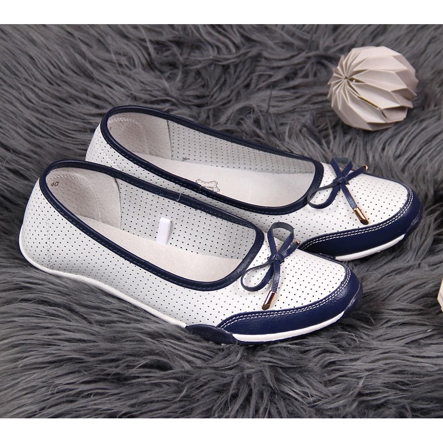 Women's Ballerinas Leather Openwork White Evento - Lätt, elegant och bekväma skor under varmare dagar. Tillverkad av naturläder med en extern öppen delstruktur, som ger utmärkt ventilation, idealisk för vardagliga stiliseringar och sommarutgångar. Komfortskor med en mjuk, läderinsats garanterar komfort under dagen - perfekt för arbete, promenader och resor.