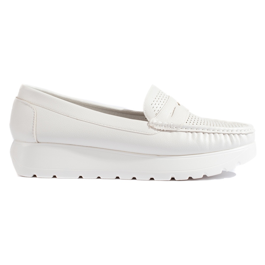 Den 4 cm höga plattformen säkerställer komforten i användningen, och den sulan som är gjord av plast med en slitbanan gör loafers inte bara fashionabla, utan också praktiska. Perfekt för våren och sommaren kommer dessa vita loafers att arbeta både på sociala sammankomster och dagliga promenader.