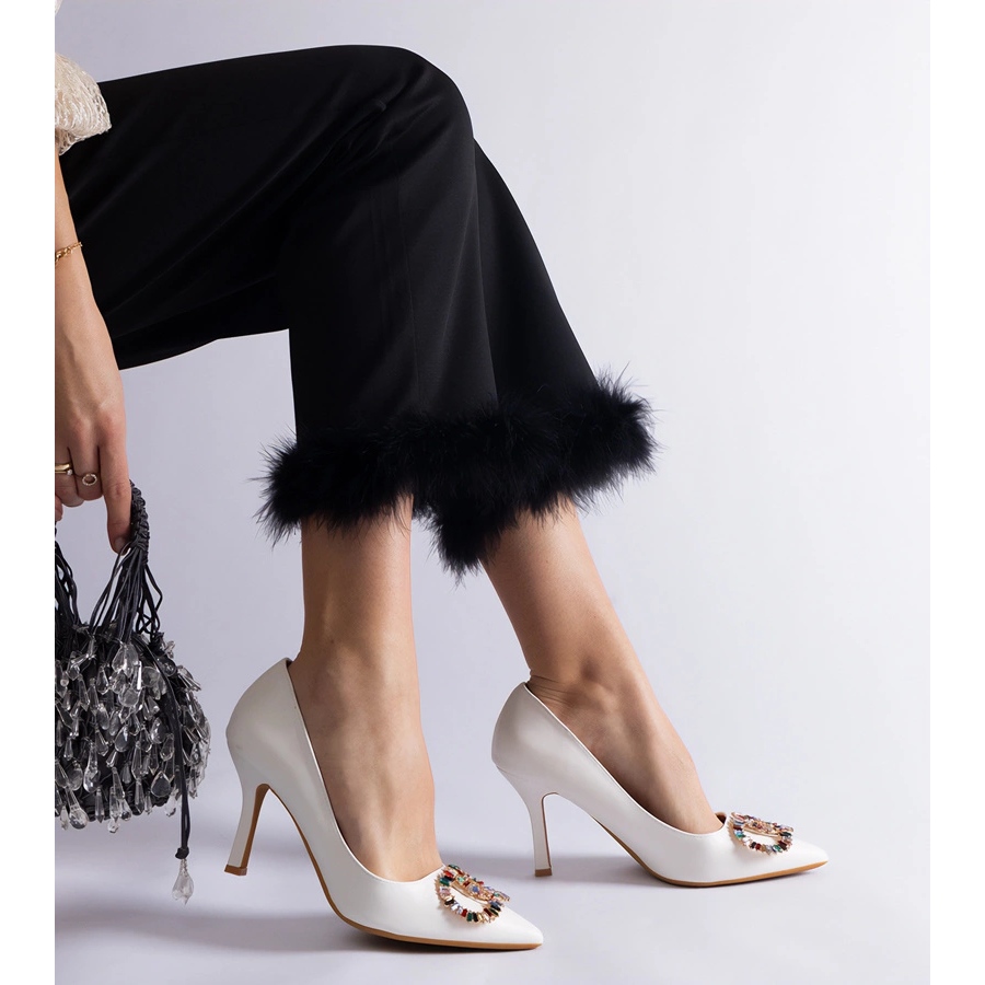 Vita höga klackar dekorerade med färgglada zirkoner är ett idealiskt förslag för kvinnor som vill lägga till lite glöd till sina stiliseringar. Dessa eleganta pumpar kombinerar klassiker med en modern design, vilket gör dem till ett utmärkt val för olika tillfällen - från eleganta evenemang till avslappnade möten.