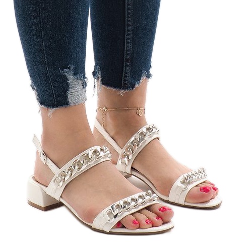 Upptäck elegans och komfort med vita 77-15 högklackade sandaler, det perfekta valet för moderna kvinnor. Dessa unika sandaler har ett spänne och kombinerar perfekt klassisk stil med moderna accenter. En dekorativ kedja som flätar ihop skorna på två ställen ger dem en unik karaktär som väcker uppmärksamhet och framhäver varje styling.
