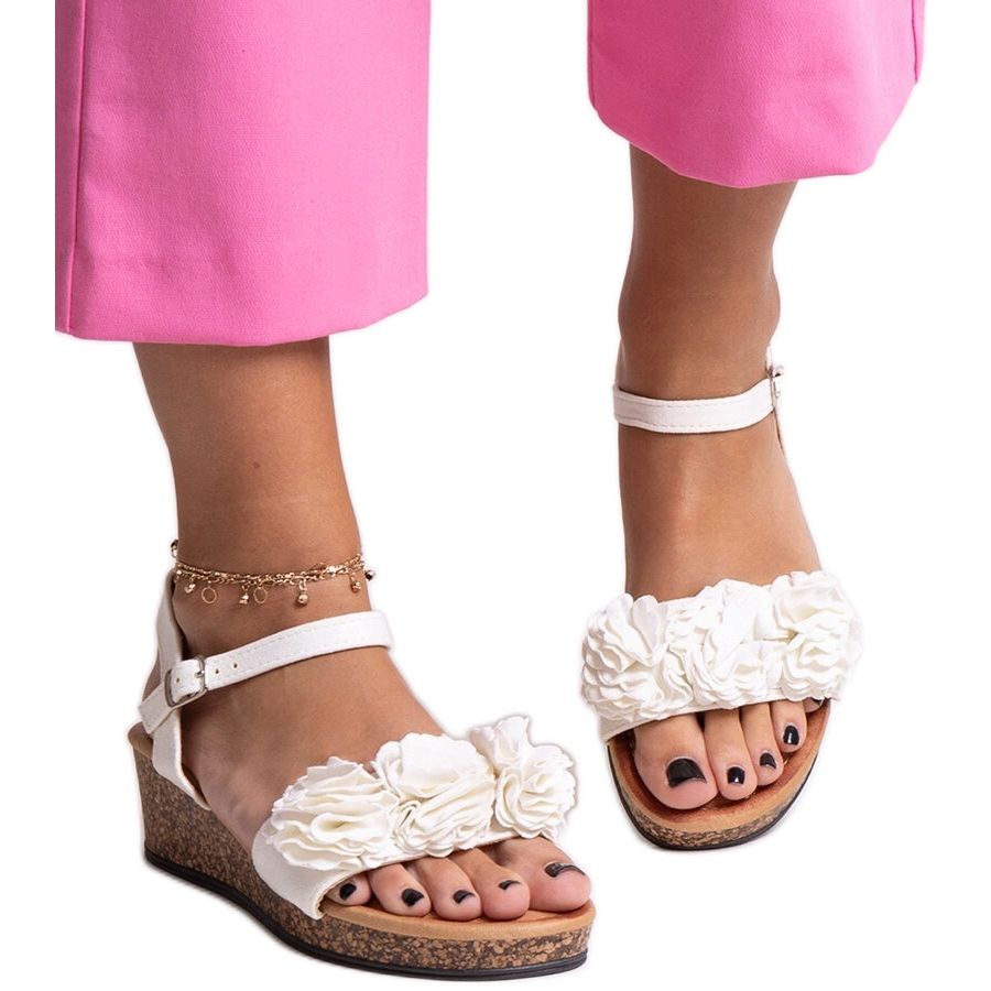 Detaljer: Vita kilsandaler med Meaza-blommor