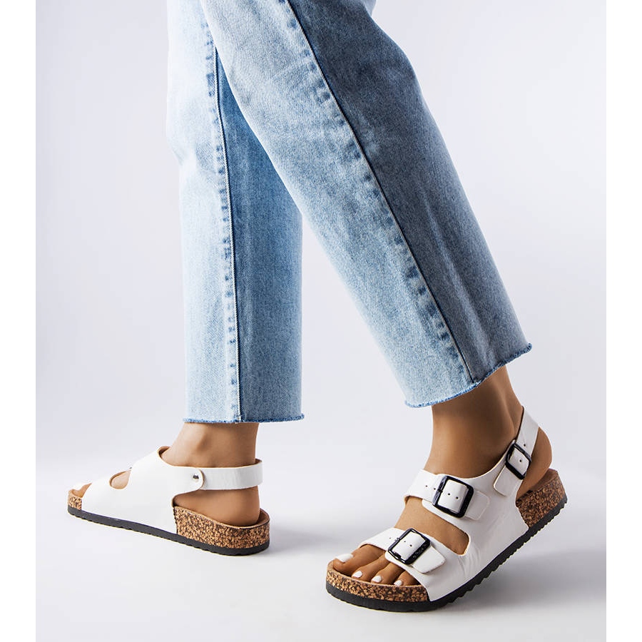 Dessa sandaler kännetecknas av klassisk estetik i kombination med moderna inslag. De har en moderiktig vit färg, medan den kontrasterande svarta sulan ger karaktär och unikhet. Tack vare användningen av spännen som fästelement möjliggör sandalerna exakt anpassning till foten, vilket säkerställer individuell bärkomfort.