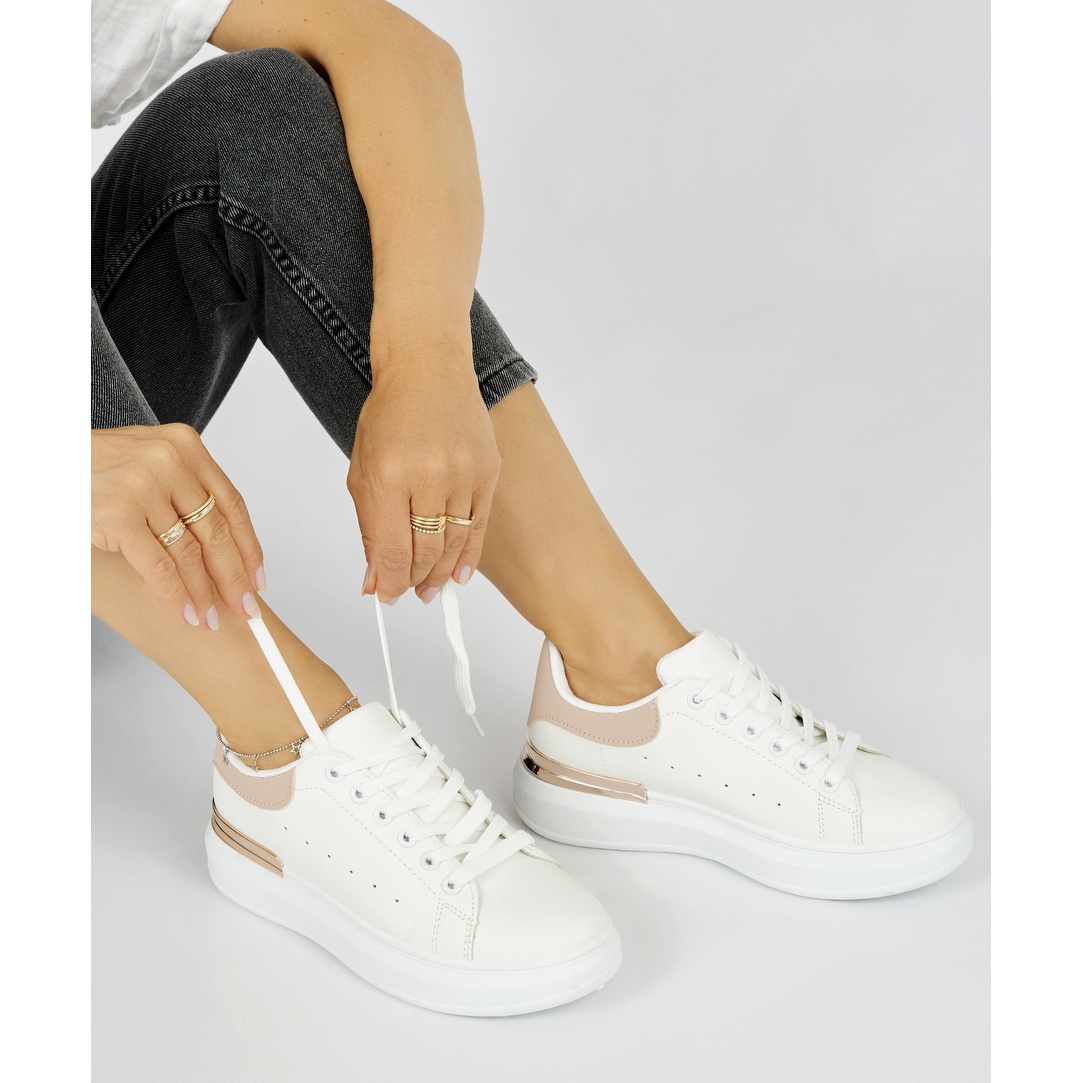 Sneakers är tillverkat av ekologiskt läder, sneakers med sin eleganta vita färg med en subtil rosa accent som ger dem karaktär. Hälen är byggd -up och mjuk, vilket säkerställer komfort och fotstabilitet.