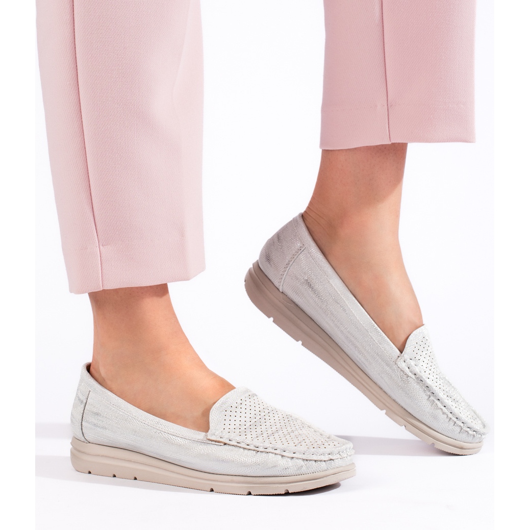 Vita loafers har en rund näsa, vilket ger dem en subtil och elegant blick. Tack vare den låga hälhälen, som bara når 3 cm, är de perfekta för vardagliga stiliseringar, och samtidigt kommer ett perfekt komplement till mer formella kläder.