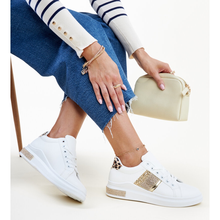 Deras runda näsa garanterar komfort under dagen, och dekorativa strass i gyllene färg ger dem en elegant glöd, vilket gör varje utseende unik. Tack vare den vita gummisulan erbjuder sneakers god vidhäftning och stabilitet, och tyginsula ger tillräcklig ventilation.
