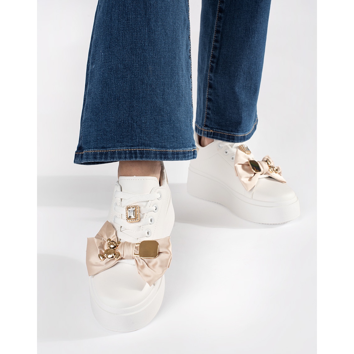 Högt, att nå framför kuberna erbjuder inte bara komfort, utan också ytterligare stöd för foten, vilket gör dem till det perfekta valet dagligen. Sneakers inbäddade på en 4 cm hög plattform lägger till lätthet och betonar figuren, tack vare vilken varje steg blir ett nöje. Byggd -i hälen och en rund näsa kombinerar stil med funktionalitet.