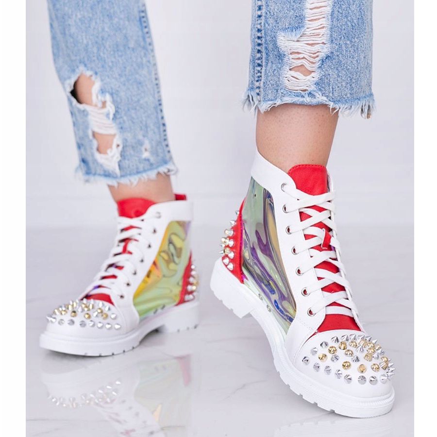 Upptäck unika Lea-stövlar som gläds inte bara med sitt utseende, utan också med komfort! Dessa vita och röda sneakers är det perfekta valet för kvinnor som vill lägga till lite spets till sin styling. Tillverkade av ekologiskt läder ser de fenomenala ut tack vare den delvis genomskinliga ovandelen i holografisk färg.