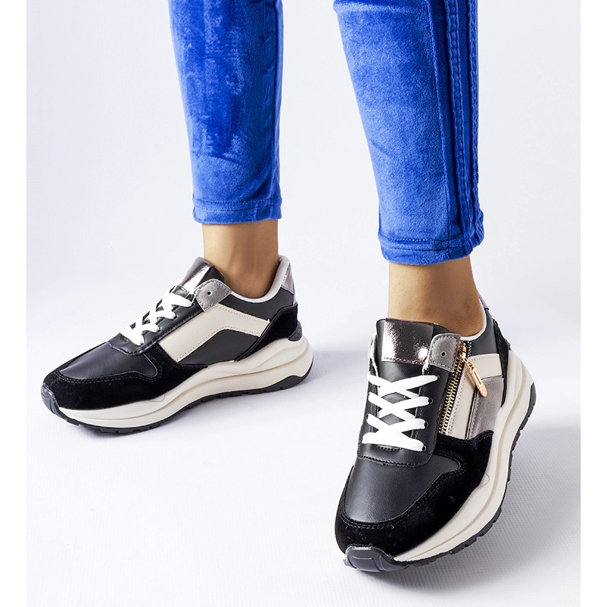 Moderna, låga kvinnors sneakers CECCHI 9105-SP kombinerar universell design med hållbara material. Den yttre delen av ekologiskt läder av hög kvalitet och en gummisula säkerställer komfort och motstånd mot daglig användning, och den klassiska kombinationen av svart och en metallisk, silver accent ger skorna en fashionabel karaktär.