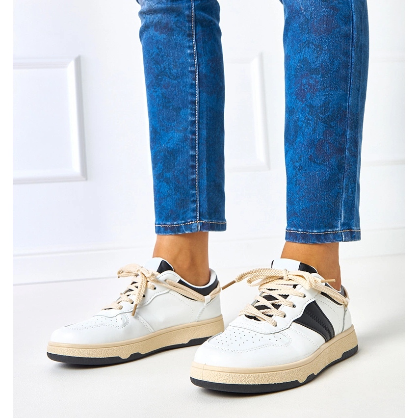 Sneakers bundna på snören i färgen på insatserna gör att du perfekt kan matcha foten. Höjden på plattformen på 3 cm gör dem inte bara snygga, utan också bekväma i längre dagar. Modellen är tillgänglig i standardnumrering, vilket gör det lättare att välja rätt storlek.