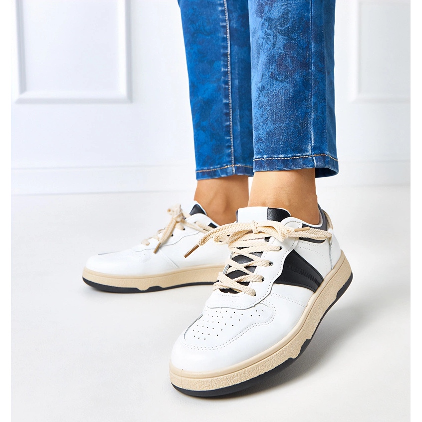 Vi presenterar de vita och svarta kvinnornas sneakers Marcella, som tar dig i tid till stilen på 90 -talet. Tack vare deras unika design kännetecknas dessa sneakers av många insatser och en färgglad slitbanan, vilket gör dem till ett utmärkt val för varje tillfälle. Perforering på en rund näsa ger dem inte bara karaktär, utan ger också slitage.