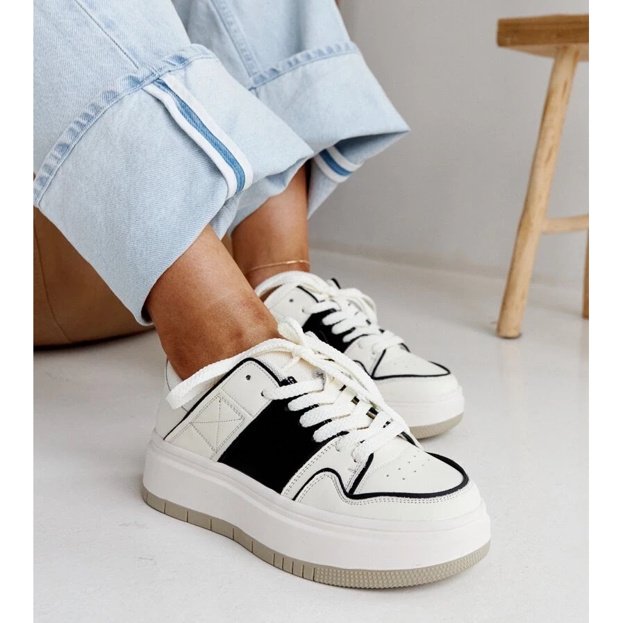Vita och svarta sneakers Abrar kännetecknas av en elegant, rund näsa som tillför all subtilitet och harmoni. Detta är ett idealiskt förslag för personer som letar efter skor som matchar både sport och avslappnade stiliseringar. I kombination med dina favorit jeans eller en lätt klänning kommer de att skapa ett unikt utseende.
