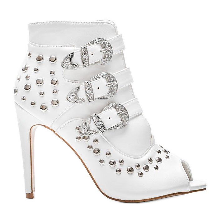 Vi presenterar vita Abigail högklackade pumps, som kombinerar elegans med en unik stil. Dessa höga klackar kännetecknas av en vacker finish, tack vare dekorativa nitar och iögonfallande dekorativa spännen som ger dem karaktär. Spännena är fästa på elastiska band, vilket säkerställer perfekt passform till foten och komfort att bära.