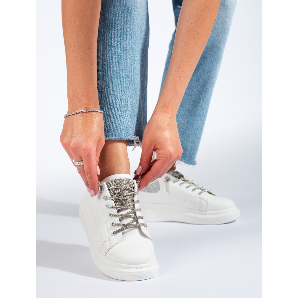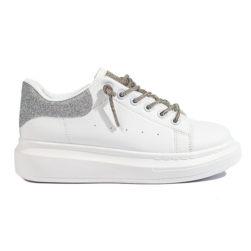 SHELOVET vita sportskor utmärker sig genom sin minimalistiska men uttrycksfulla vita färg, med silveraccenter som ger dem en unik karaktär. Runda tår och snörning säkerställer att skorna sitter perfekt på foten och bibehåller komforten på högsta nivå.