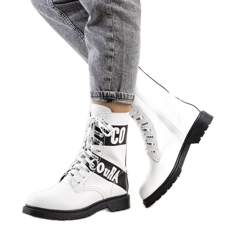 Snygga stövlar som kommer att vara ett idealiskt komplement till höst- och vinterstyliseringar. Modellen stiliserad för trapper kombinerar en modern, rå karaktär med feminin lätthet - den övre av högkvalitativ ekologisk läder är dekorerad med ett spektakulärt tryck med inskriptioner. Tack vare den rundade tån och platta hälen (3 cm) är skorna bekväma för vardagskläder.
