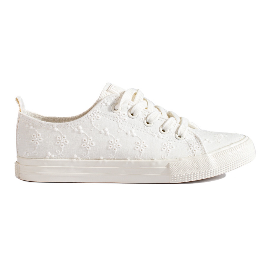 Ytter- och innermaterialet är tillverkat av 100 % textiltyg, vilket ökar användarkomforten och gör det lättare att hålla skorna rena. Den klassiska vita färgen i kombination med delikat spets är en intressant detalj och ger skorna en flickaktig charm. Big Star-designers såg också till att tårna var runda och fylliga, och snörningsförslutningen gör att sneakersna passar perfekt till foten.