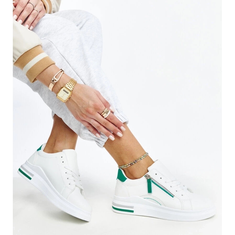 Ett av de viktigaste elementen i modellen är en tjock, dekorativ kedja som har blivit hit för denna säsong. Det lägger till originalitet och får dig att uttrycka din individuella stil. Vita sneakers med gröna accenter passar perfekt in i nuvarande trender och är samtidigt praktiska och enkla att använda.