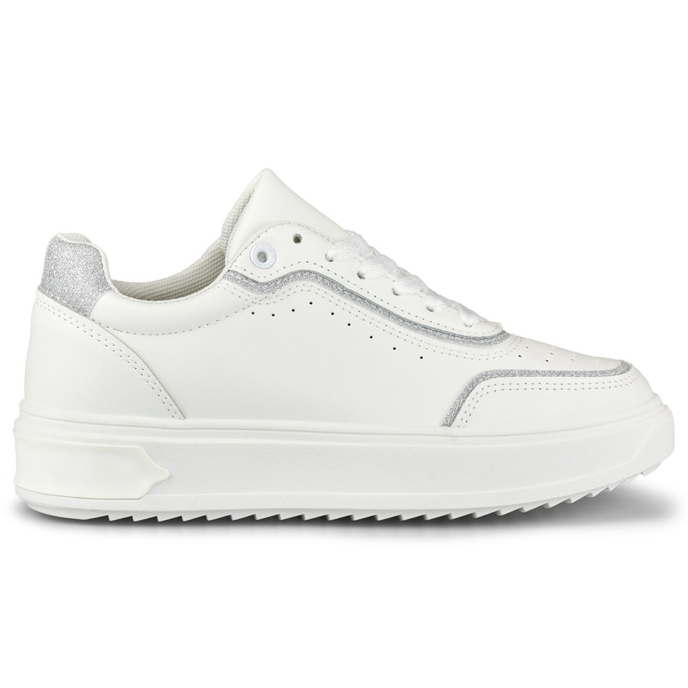 Klassiska, feminina och bekväma vita sneakers med subtila silver accenter är måste-ha våren/sommarsäsongen. Tillverkad av högkvalitativt ekologiskt läder, på en stabil 2,5 cm -plattform, kombinerar en sportkaraktär med en modern, urban stil. Perfekt för en daglig basis - för jeans, klänningar eller en avslappnad kjol.