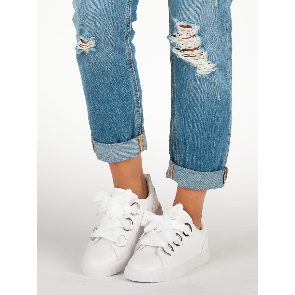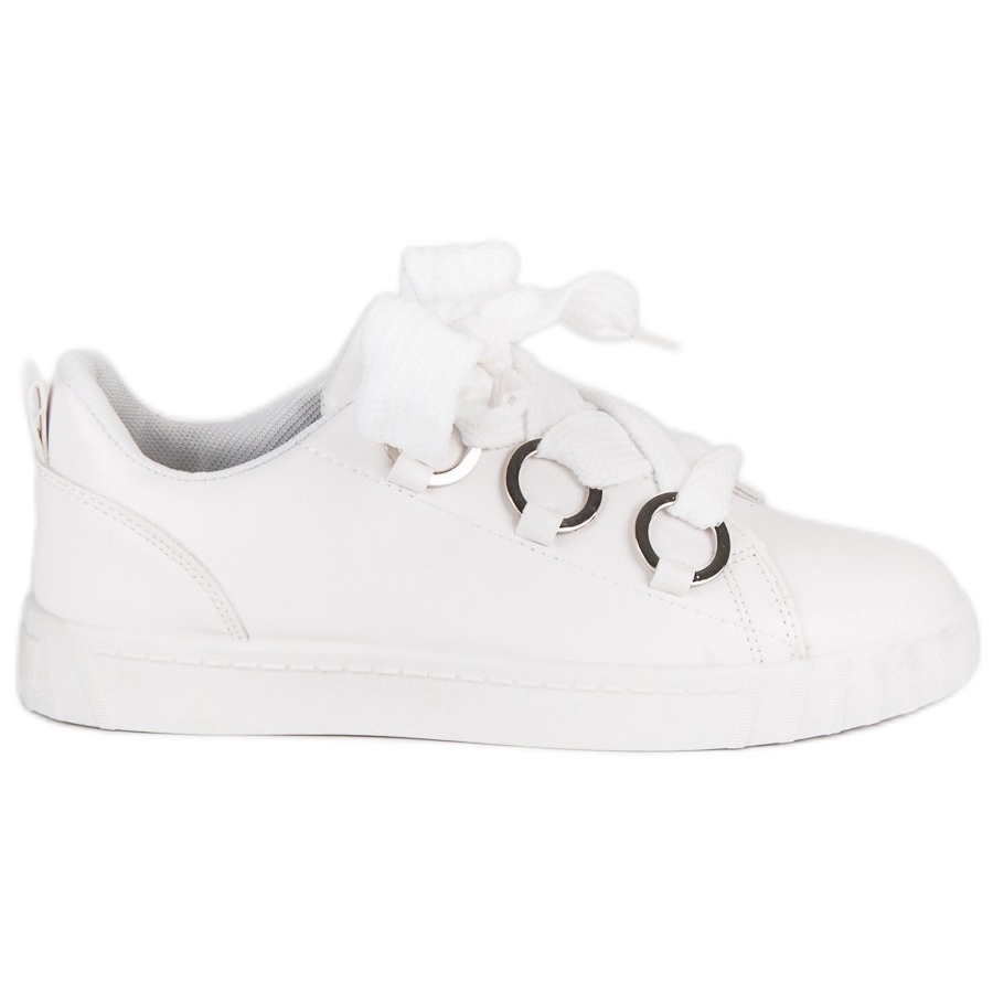 Upptäck en unik stil med vita Super Me sneakers med snörning, som kombinerar sportig avslappnad med ett elegant uttryck. Dessa fashionabla damskor kännetecknas av ovanliga, breda snören monterade på iögonfallande silverringar i metall, vilket ger dem en unik karaktär.