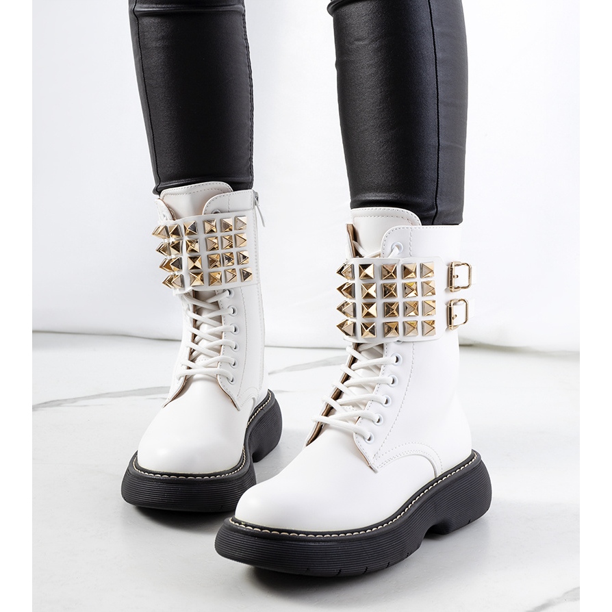 Vita stövlar med Lacer-dubbar är inte bara skor, utan ett verkligt uttryck för stil som kommer att ge en unik karaktär till varje styling. Deras överdel kännetecknas av en originalrem dekorerad med guldnubbar, vilket gör att de ser imponerande och fashionabla ut. Stövlarna är gjorda av högkvalitativt ekologiskt läder och garanterar komfort att bära hela dagen.