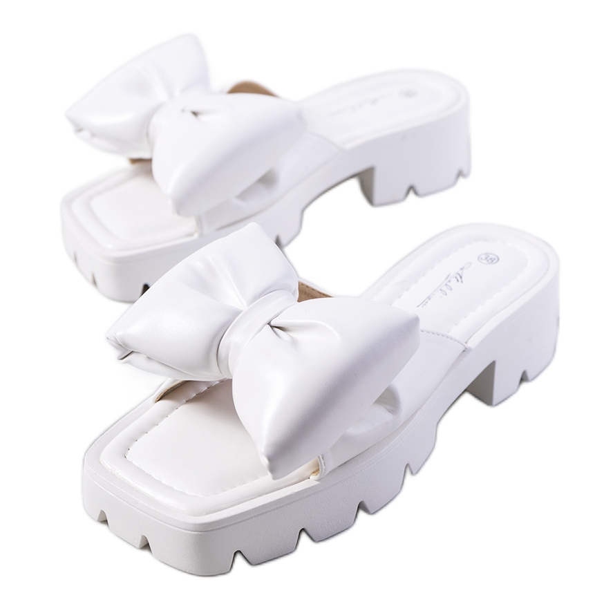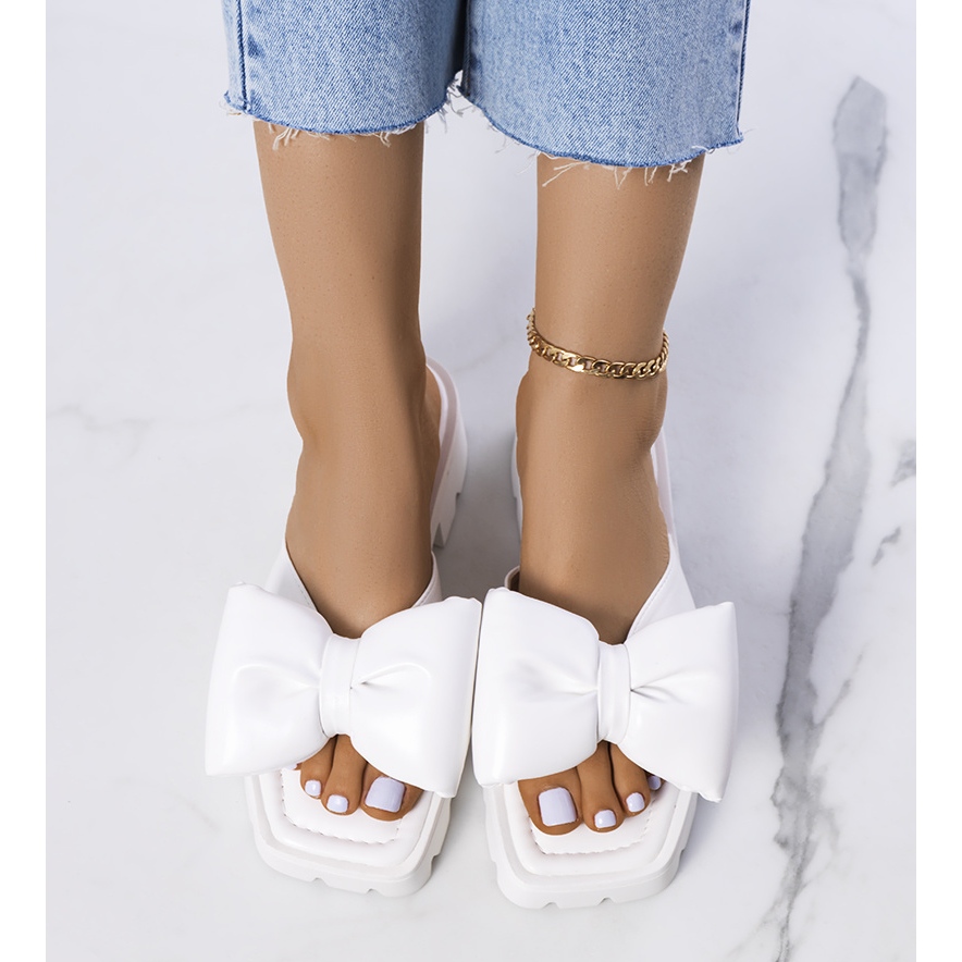 En söt rosett ger dem en subtil charm, och den runda tån gör flip-flopsna inte bara moderiktiga utan också mycket bekväma att bära. White Platt flipflops är ett perfekt val för vardagsutflykter, en promenad på stranden eller en resa utanför stan. Kombinationen av elegans och avslappnad stil gör dem perfekta för många sommaroutfits.