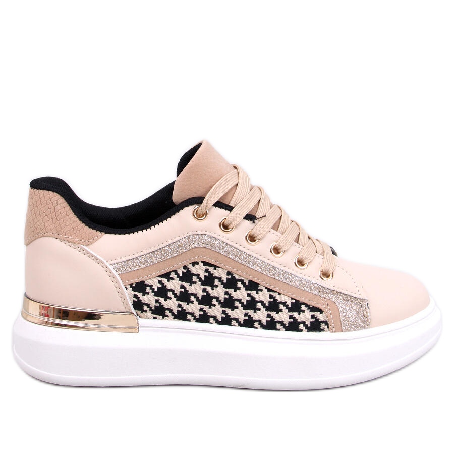 Här är Volyne Beige houndstooth-sneakers för kvinnor som säkert kommer att dra till sig allas uppmärksamhet! Dessa sportskor med snörning och hög sula kombinerar en klassisk design med de senaste trenderna. Hundstootmönstret och kombinationen av glitter och metalliska inlägg gör dem till ett riktigt måste i varje garderob.