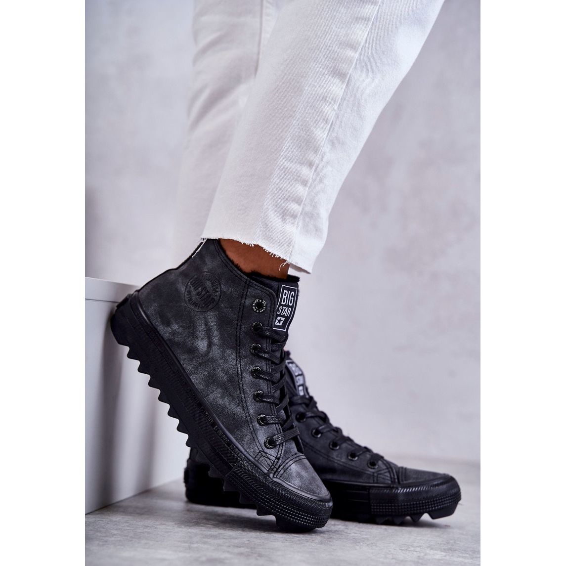 Vi presenterar de höga, isolerade kvinnors sneakers Big Star GG274069 i en modern kombination av svarta och grå färger. Dessa unika skor är den perfekta lösningen för svalare dagar, tack vare mild uppvärmning i form av kort hår, vilket ger komfort och värme.