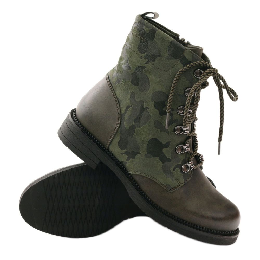 Snygg design i kamouflage nyanser gör att ingen look kan lämnas oberörd av dessa skor. En stabil 3 cm hög platt klack och en 16 cm ovandel är den perfekta kombinationen som säkerställer stabilitet och komfort under vardagliga aktiviteter. Den runda tån ger en avslappnad karaktär, och den universella gröna färgen harmoniserar med en mängd olika stilar.