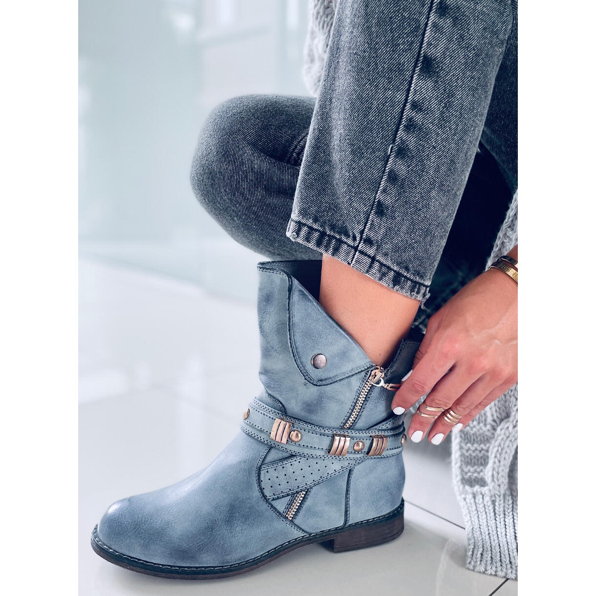 Den breda ovandelen och fashionabla remmarna med guldspännen ger dem en unik karaktär som säkert kommer att dra till sig uppmärksamhet. Tack vare den praktiska dragkedjan är det extremt enkelt och bekvämt att ta av och på kängorna.
