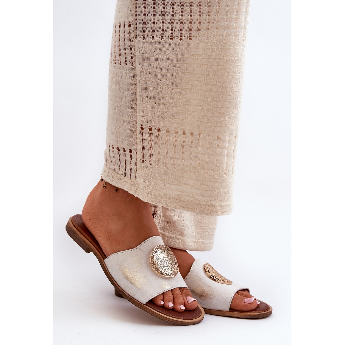 Zazoo Zazoo 2938 flip-flops i läder på en platt klack med gulddekoration, borstade gyllene